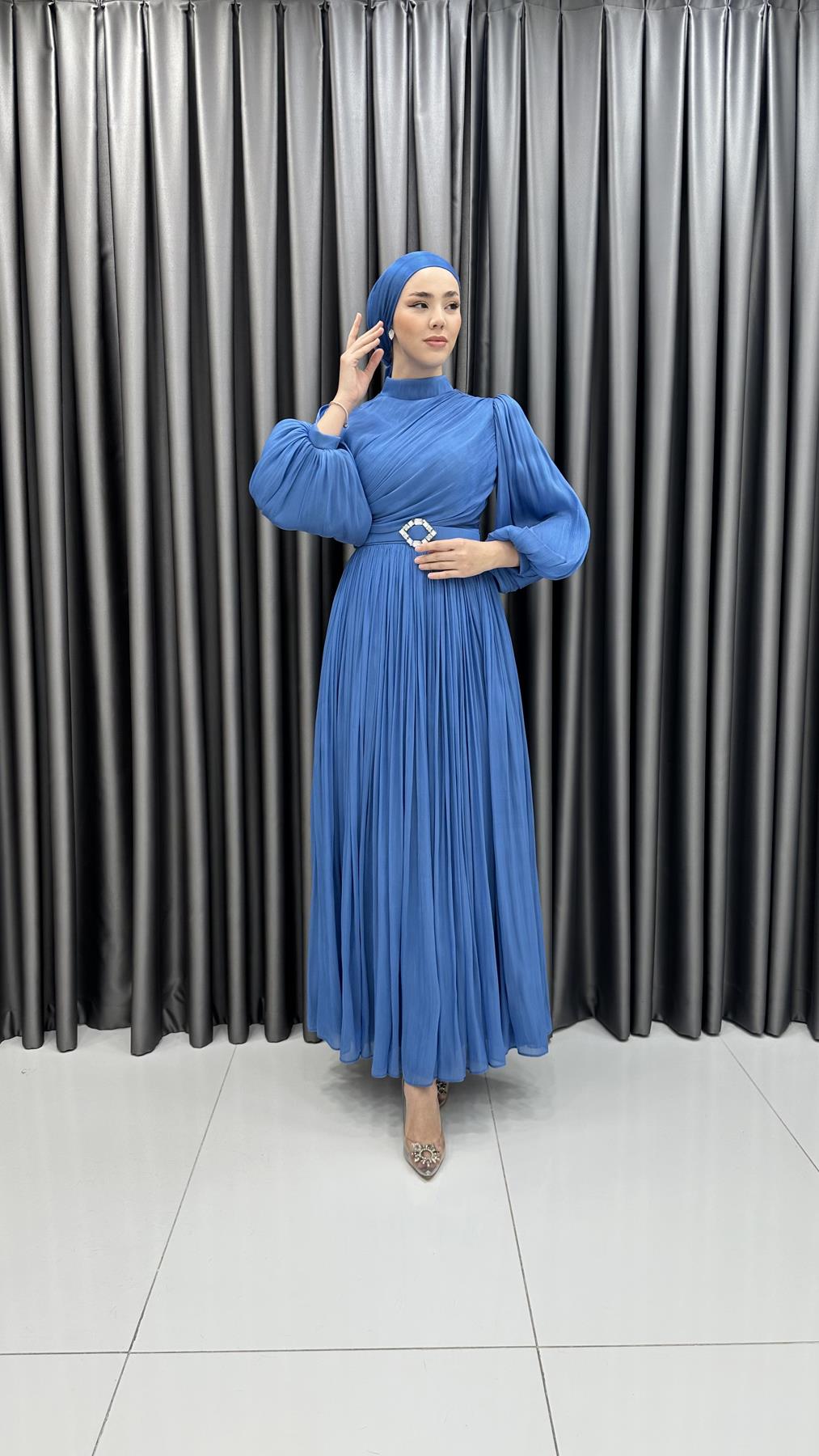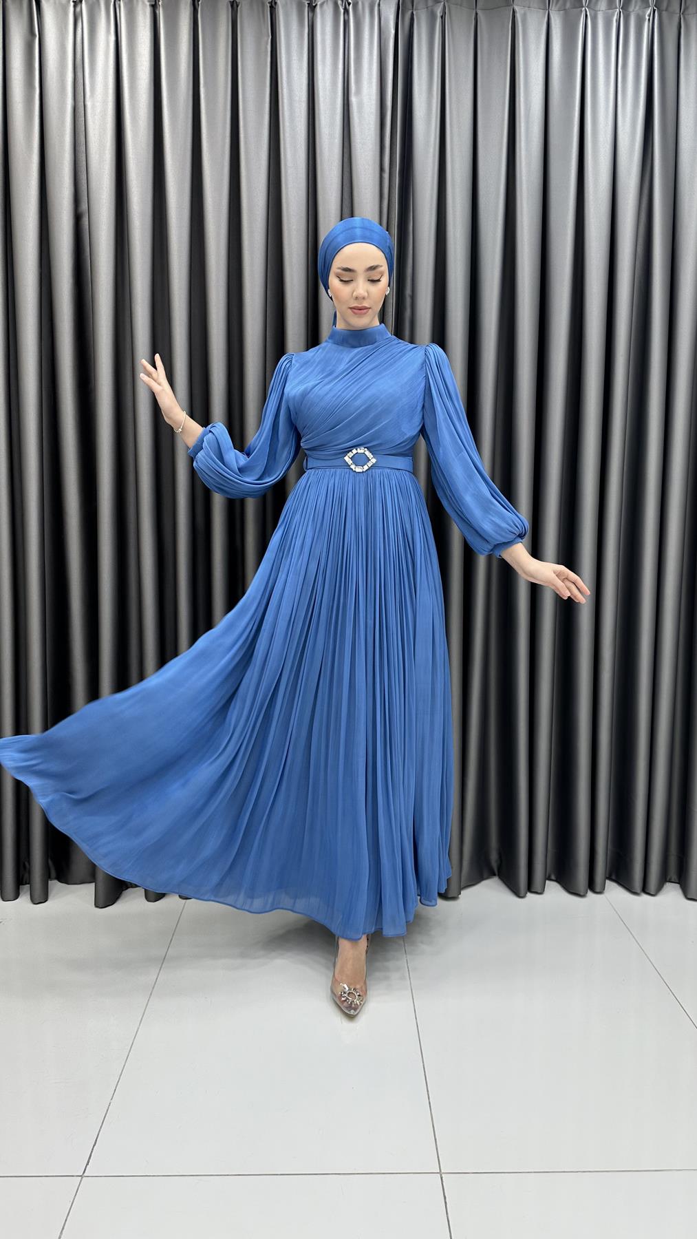 Janjan kumaşın esintili görünümünü ortaya çıkarmak için bol kesimde hazırladığımız elbisemiz, eteğinde ve gövdesinde bulunan pileler ile baş döndürücü bir tasarıma sahiptir. Balon kollar ile verilen şık ve zarif hava taş detaylı kemeriyle bütünlük kazanmıştır. Abiye elbisemizi gece davetlerinde taş detaylı hafif topuklu ayakkabılar ve zarf model saten çantalar ile kombinlemenizi tavsiye ederiz. Renk seçeneği mevcuttur.