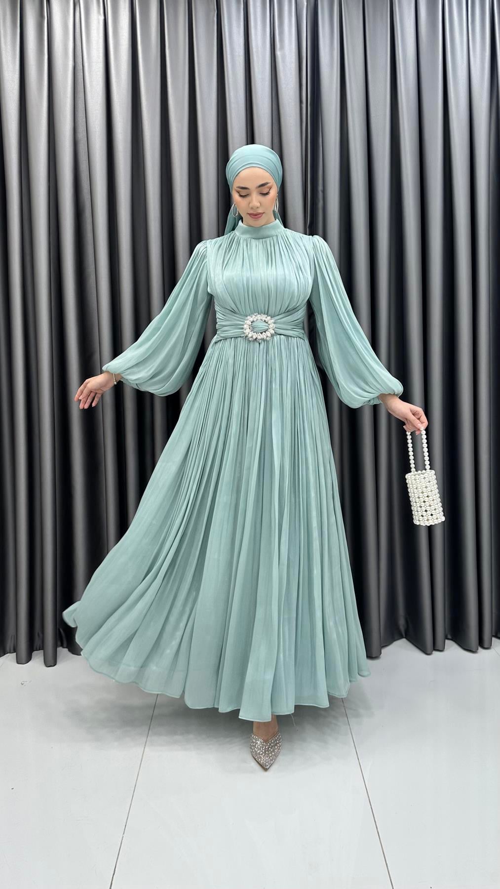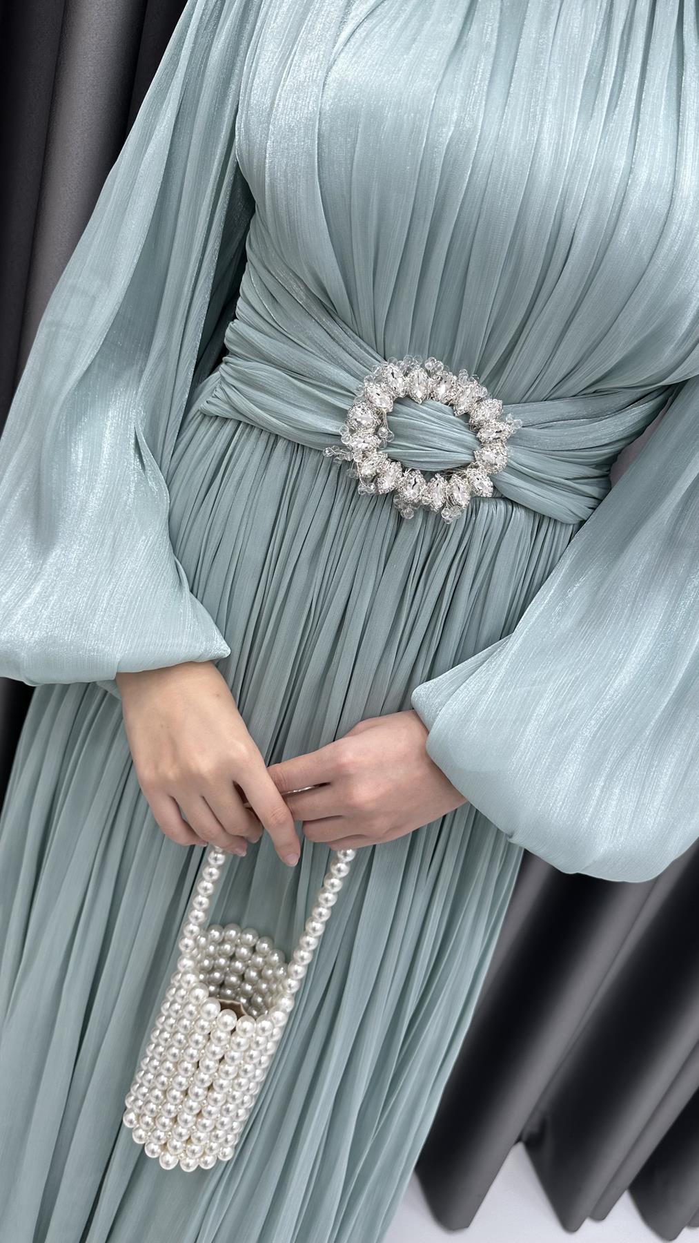 3948 T - Kemer Detaylı ve Balon Kollu Jan Jan Abiye Elbise