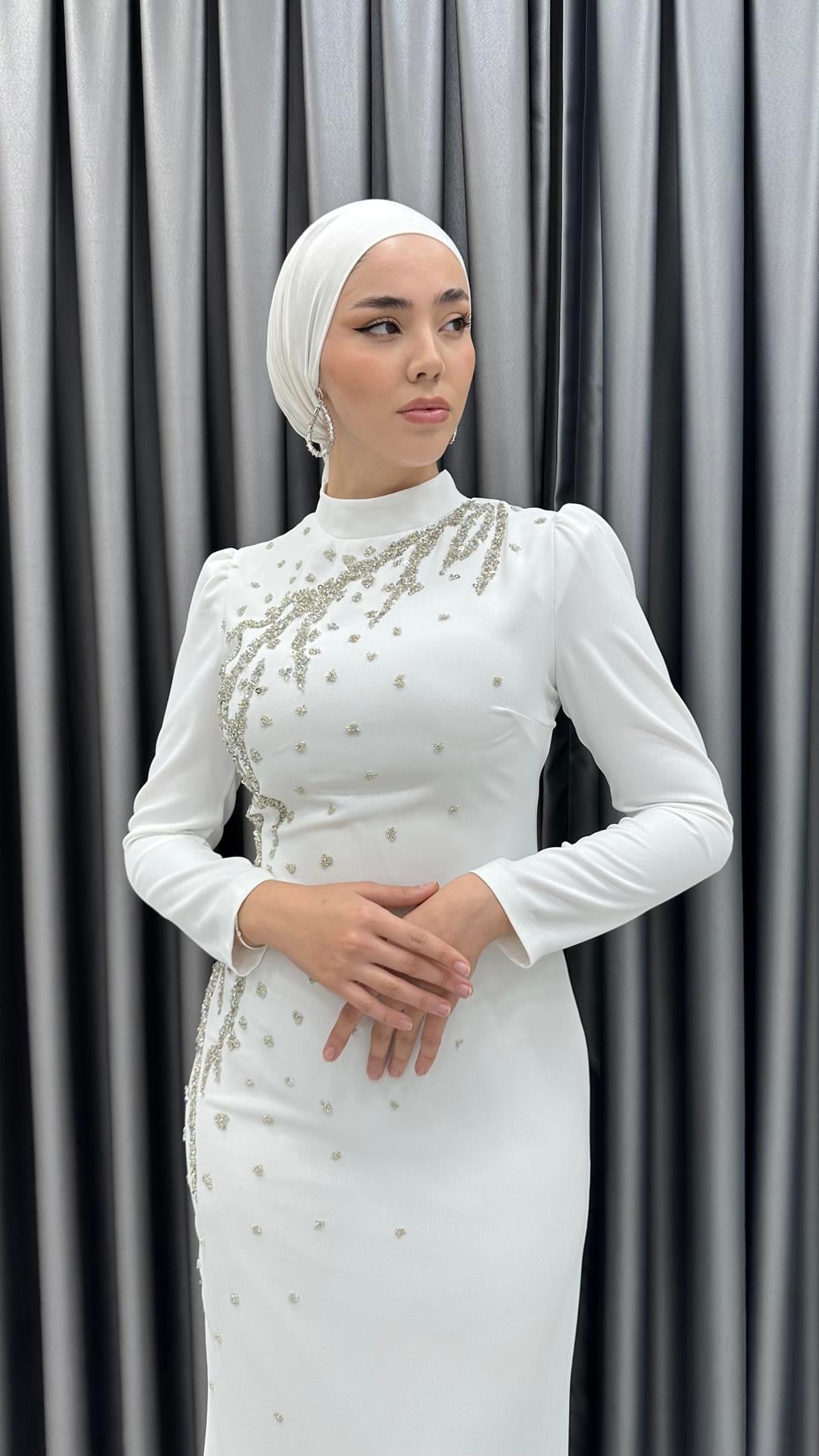 4003 T - Taş İşlemeli Balık Kesim Krep Abiye Elbise-Beyaz (1314.00649-Beyaz)