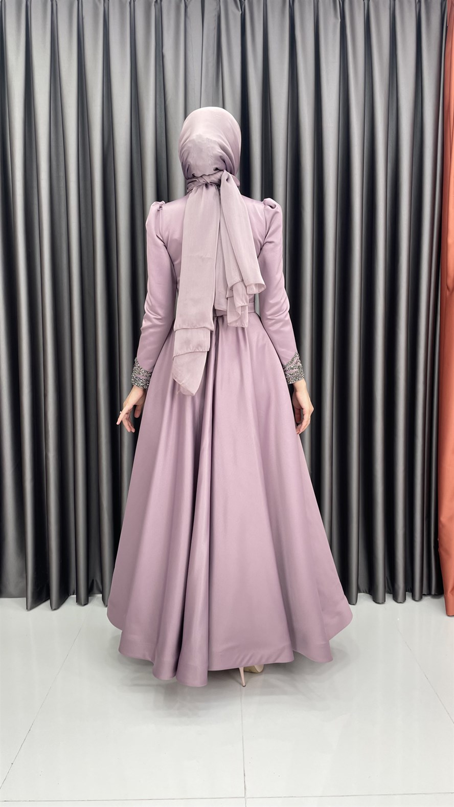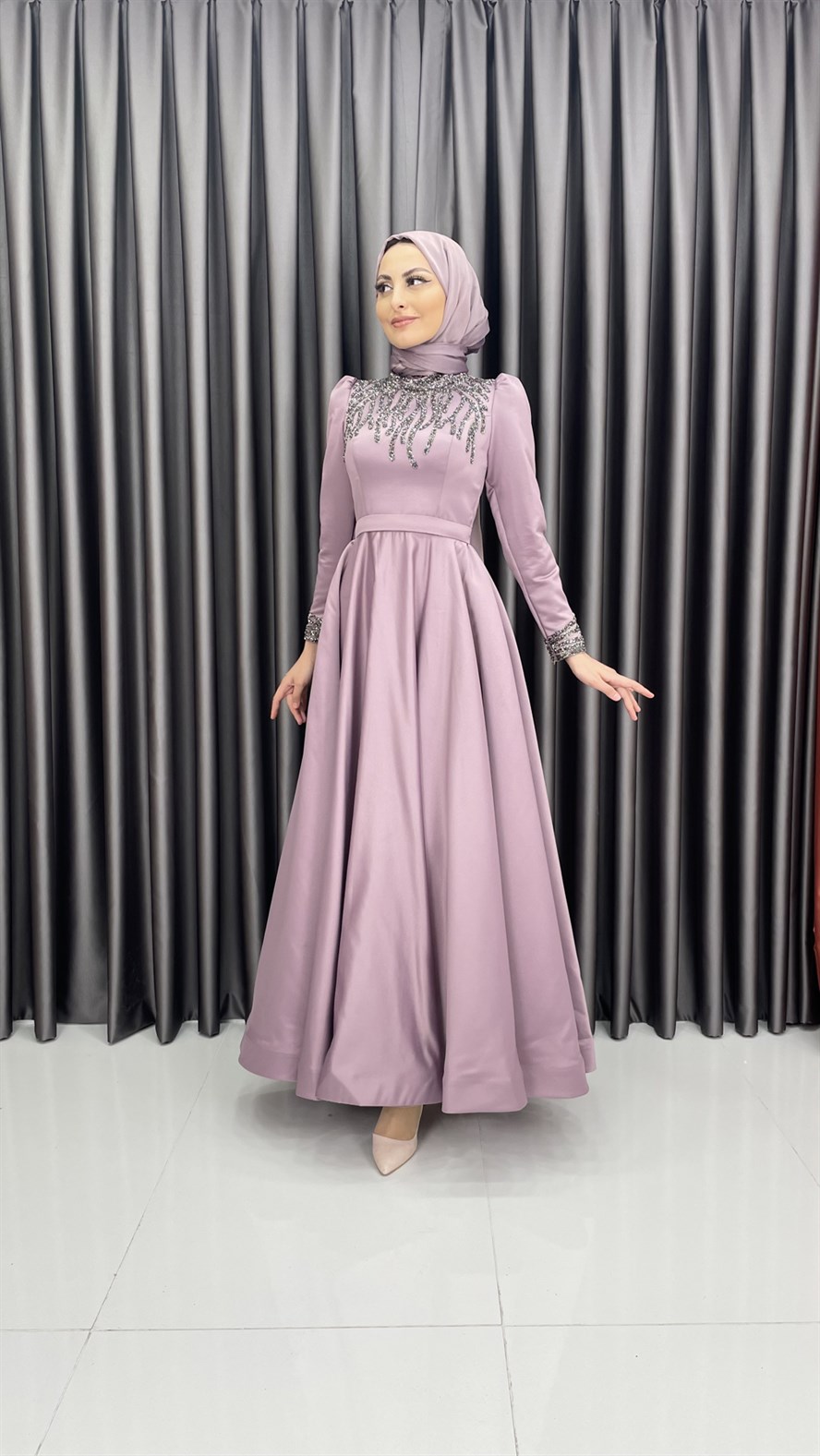 4454 H – Taş İşleme Detaylı Saten Kumaş Abiye