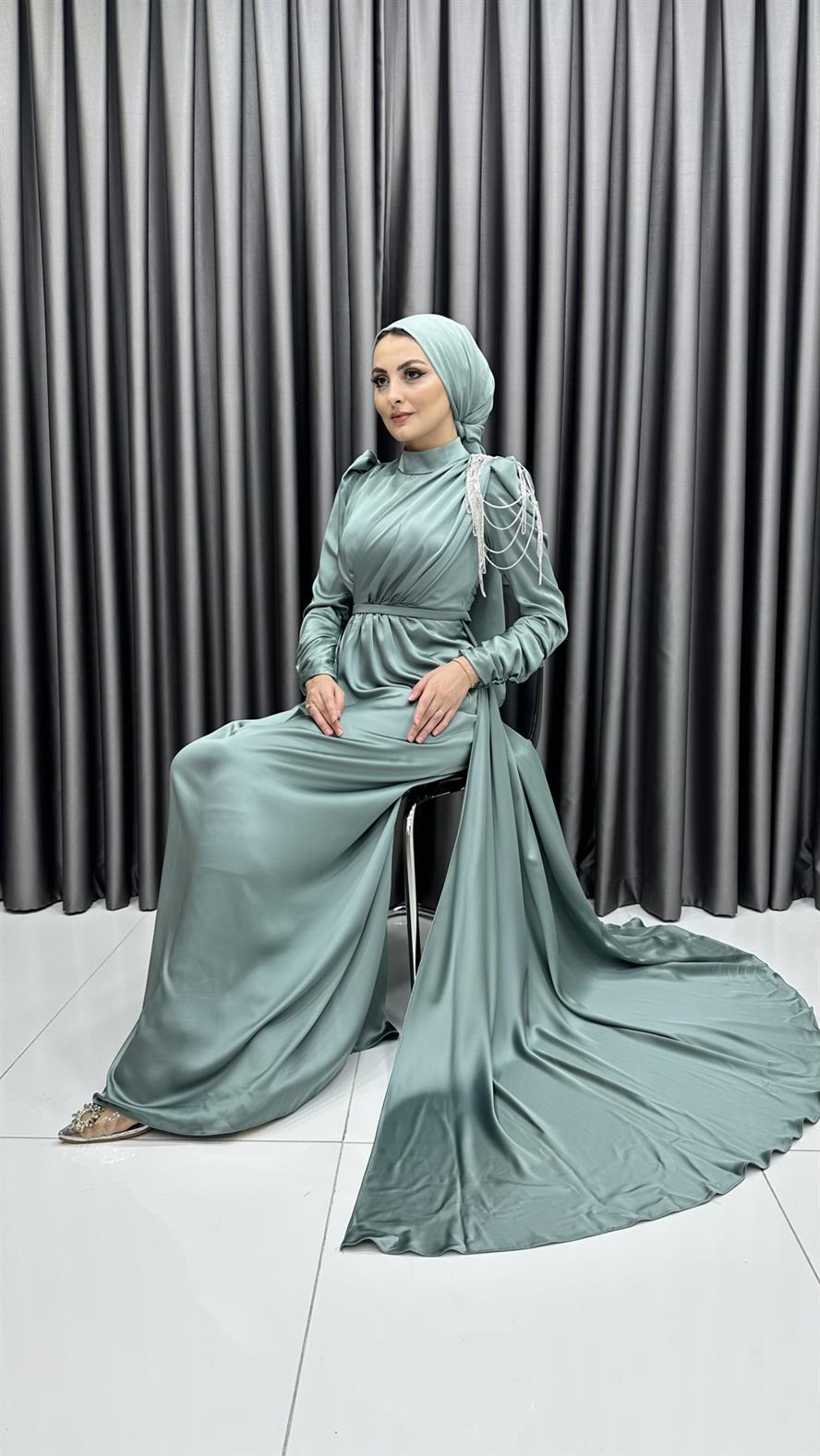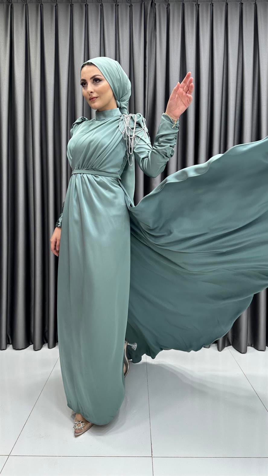 4576 H - Tek Omuzdan Boncuk Sallantılı Saten Abiye Elbise-Mint (1314.00350-Mint)