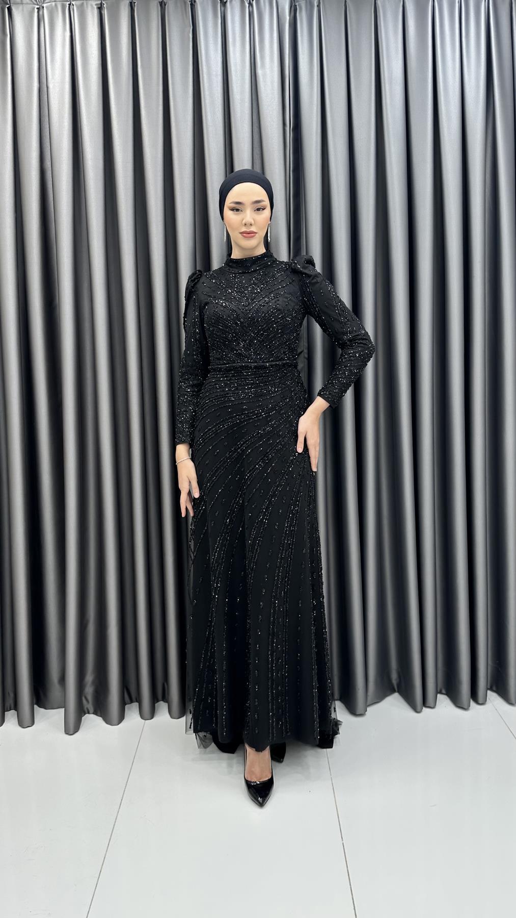 4589 H - Karpuz Kol Detaylı Taşlı Tül Kumaş Abiye Elbise
