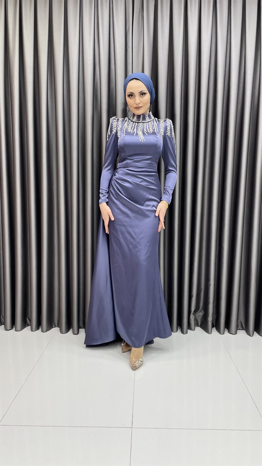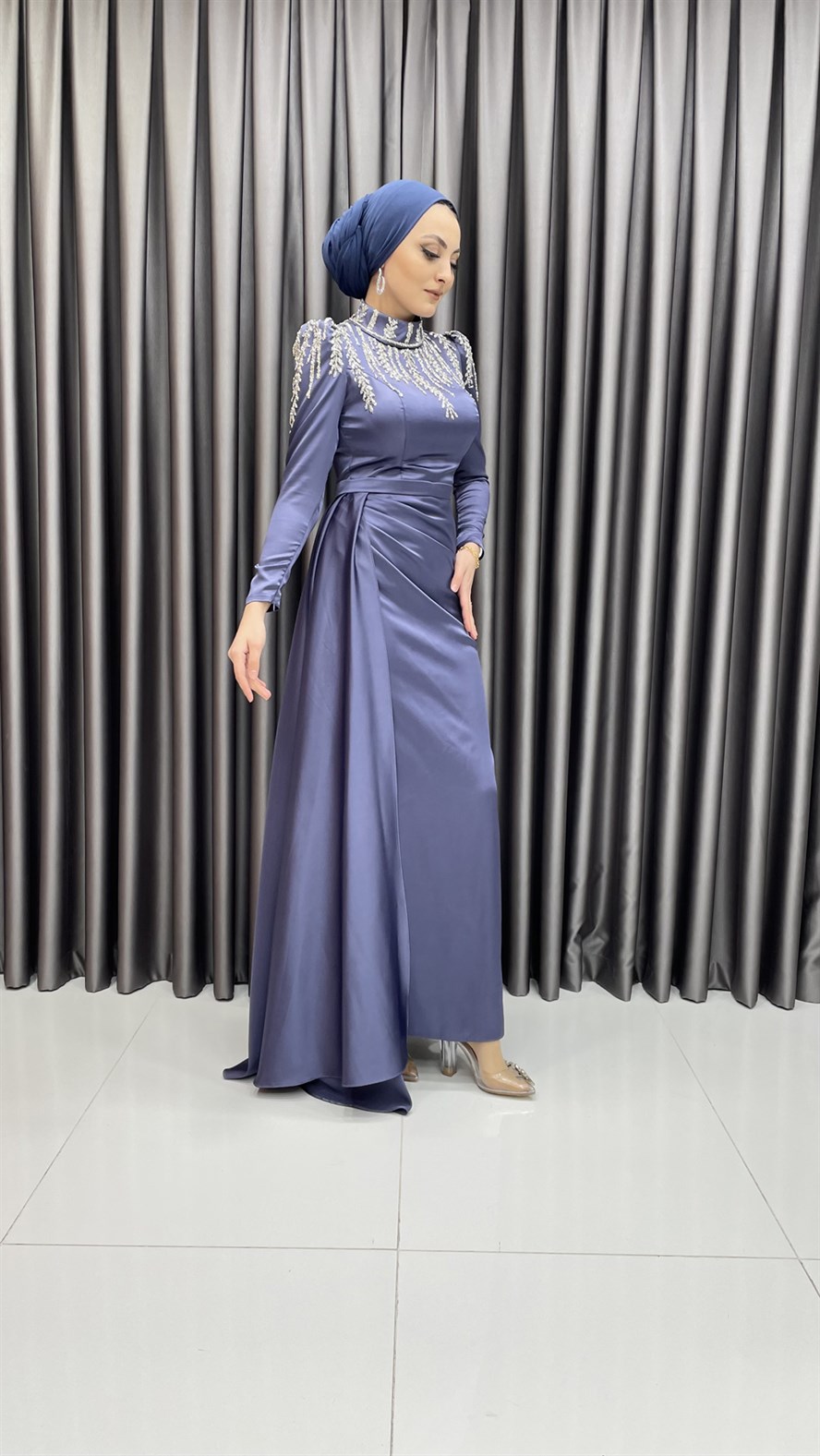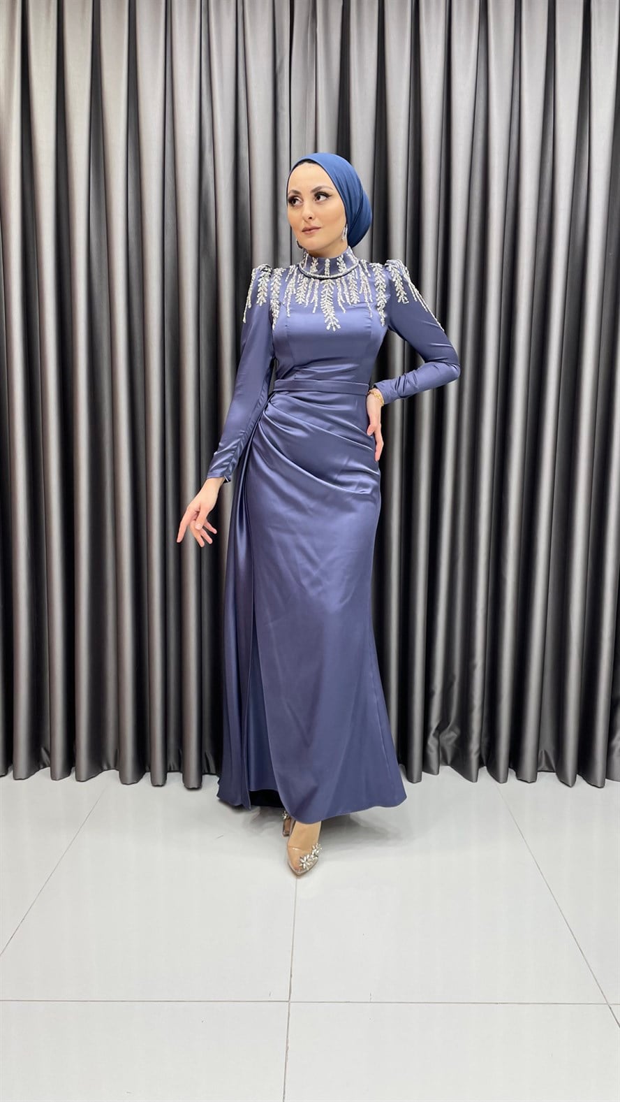 Saten abiye elbisenin yaka ve omuz kısmına eklenen parıltılı işlemeler ile şık bir görünüm elde edilmiş olup etek kısmına hacim vermek için kemer detayı altından pileli ekstra bir parça varmış görünümü verilmiştir. Saten elbiseyi yüksek topuklu ayakkabılar ve kadife işlemeli el çantaları ile kombinleyebilirsiniz.
