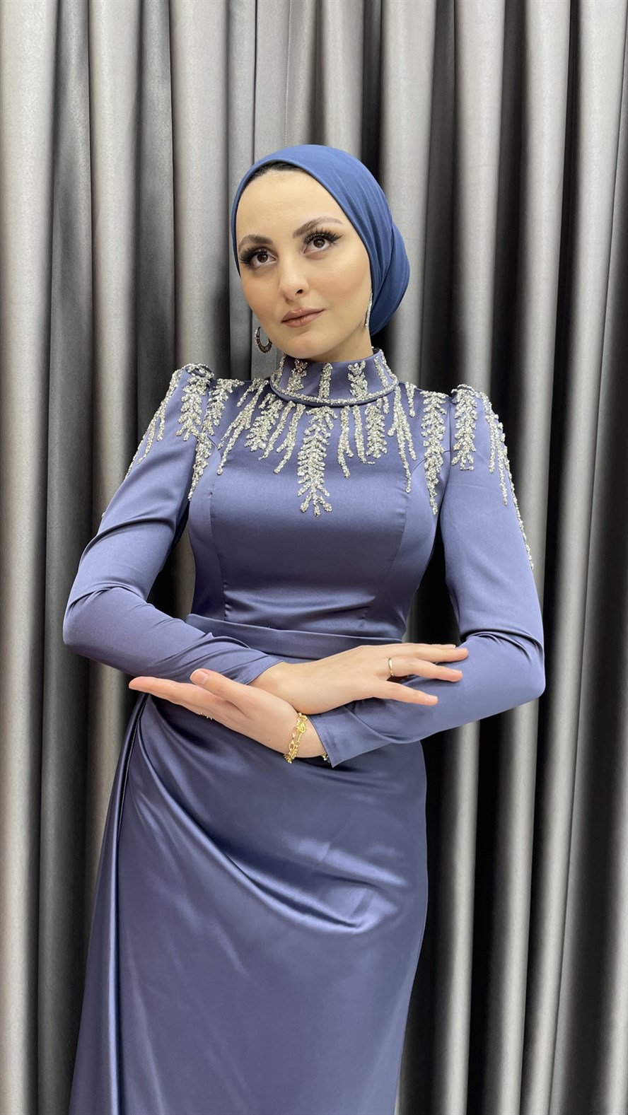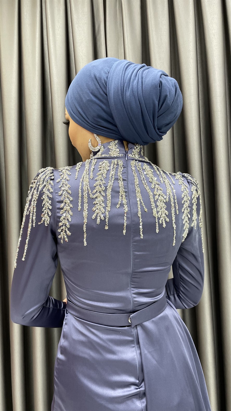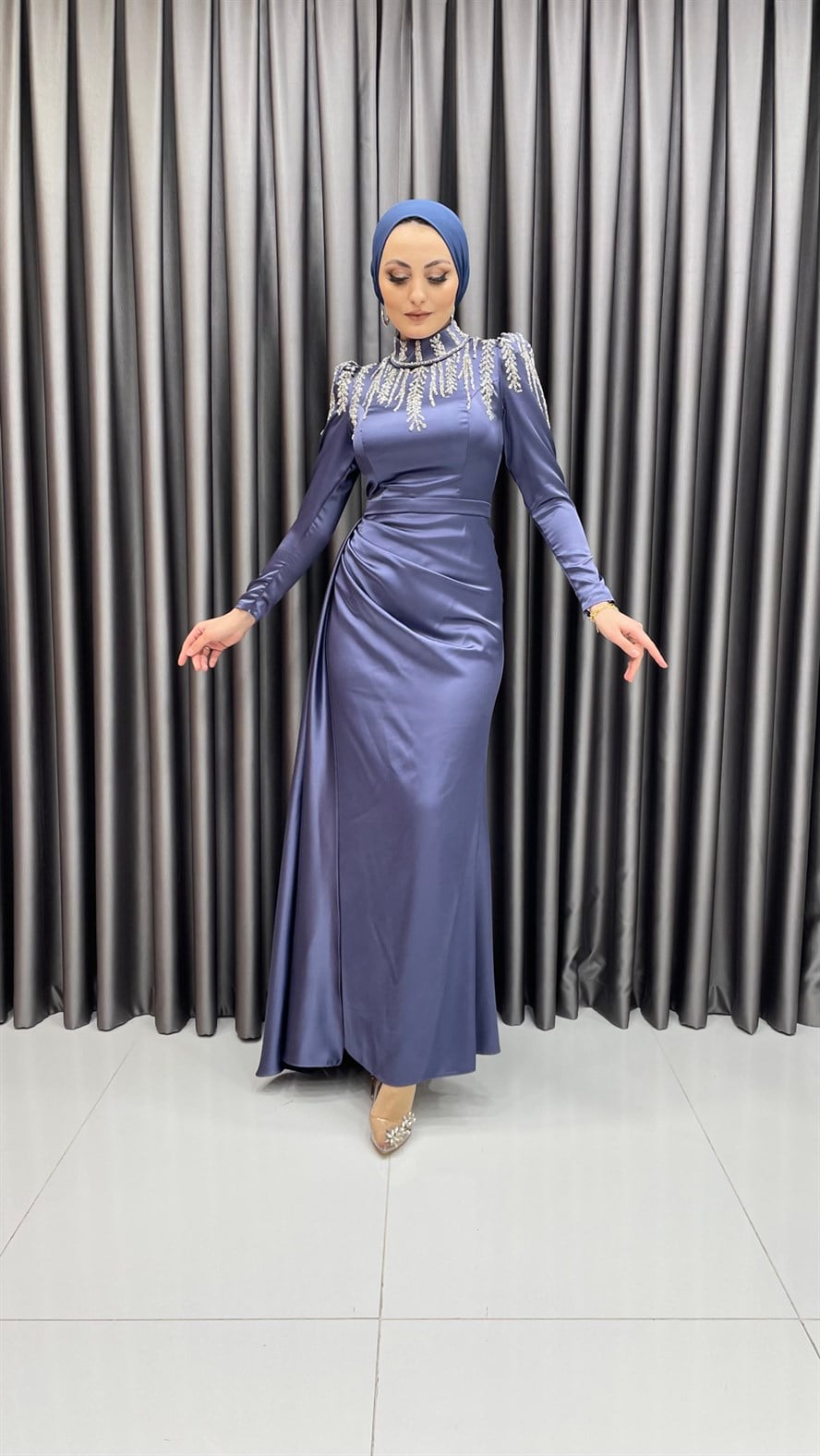 Saten abiye elbisenin yaka ve omuz kısmına eklenen parıltılı işlemeler ile şık bir görünüm elde edilmiş olup etek kısmına hacim vermek için kemer detayı altından pileli ekstra bir parça varmış görünümü verilmiştir. Saten elbiseyi yüksek topuklu ayakkabılar ve kadife işlemeli el çantaları ile kombinleyebilirsiniz.