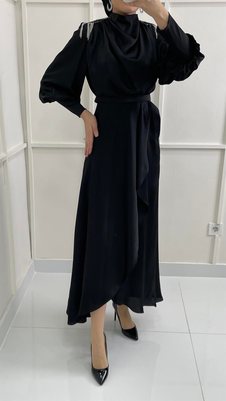 4598 H - Omuzları İşleme Detaylı Karpuz Kollu Degaje Yaka Abiye Elbise-Siyah (1314.00381-Siyah)