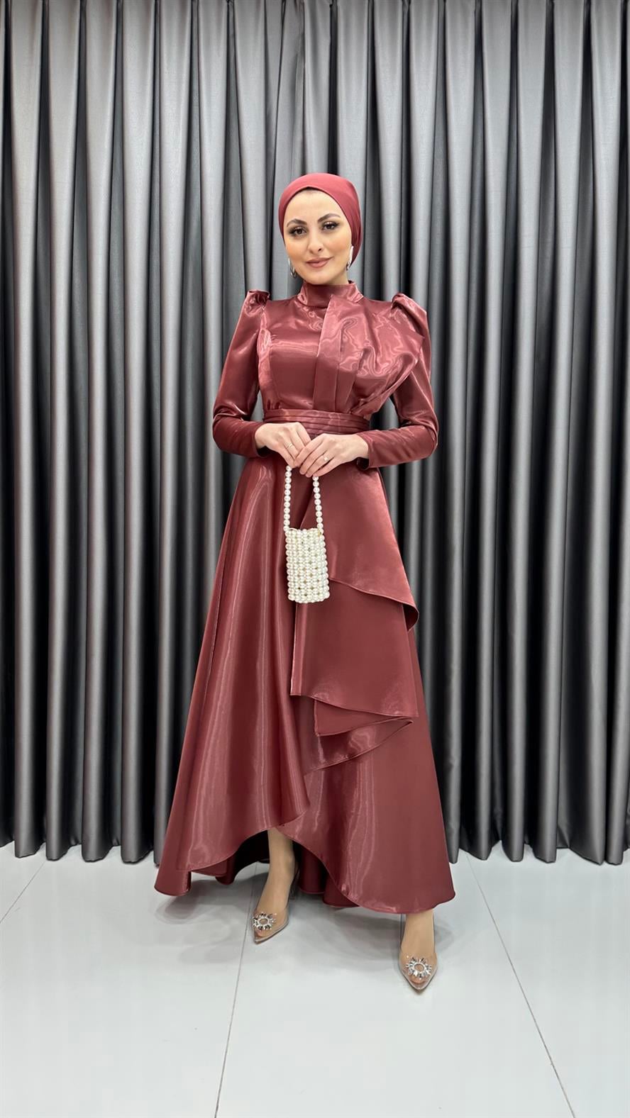 4605 H - Karpuz Kol Kat Detaylı Parlak Saten Abiye Elbise-Kiremit (1314.00417-Kiremit)
