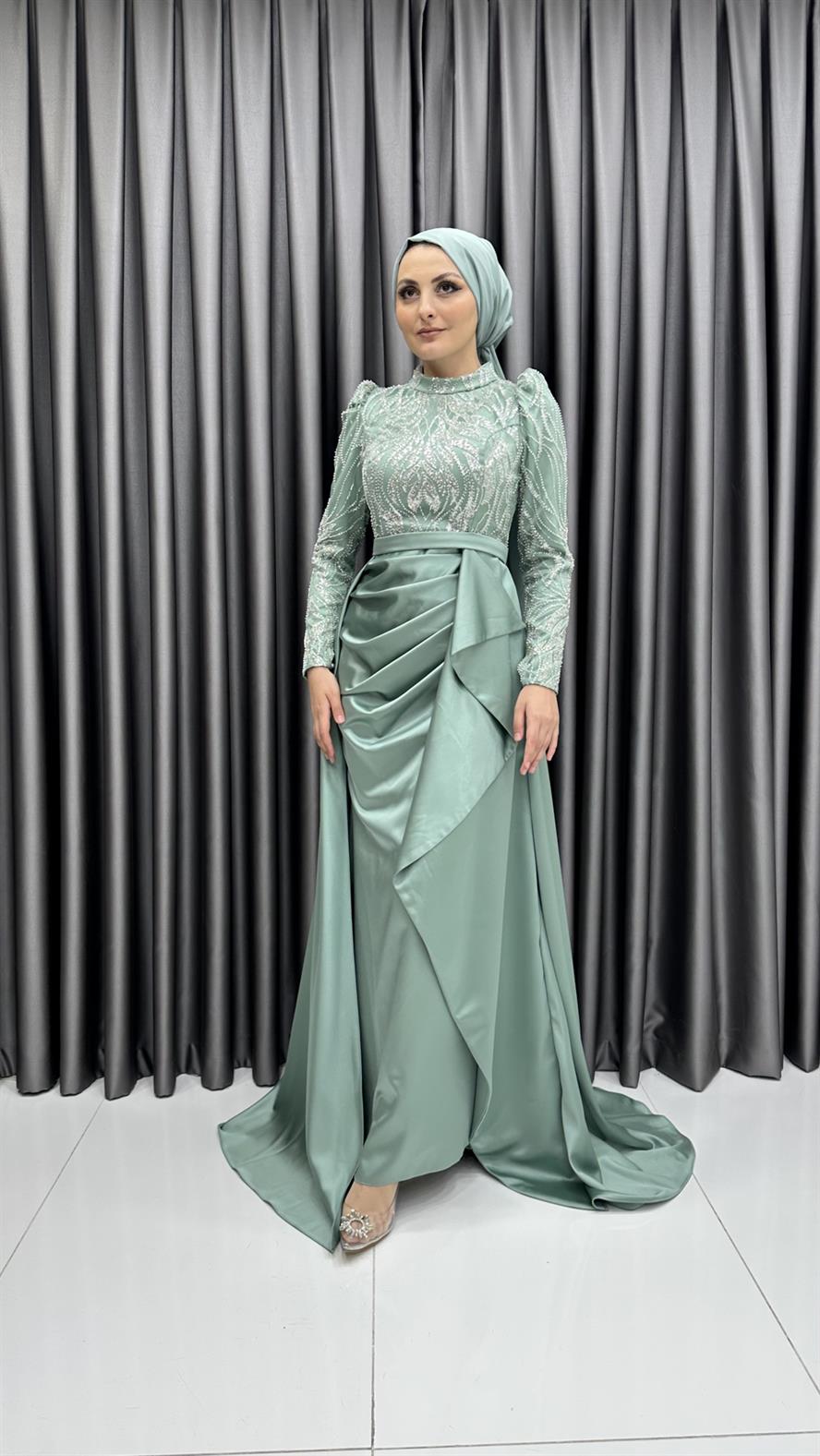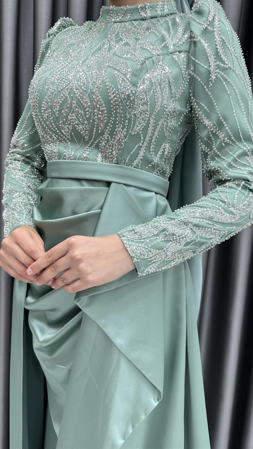 4659 H - Boncuk İşlemeli ve Ek Etek Detaylı Abiye Elbise-Mint (1314.00528-Mint)