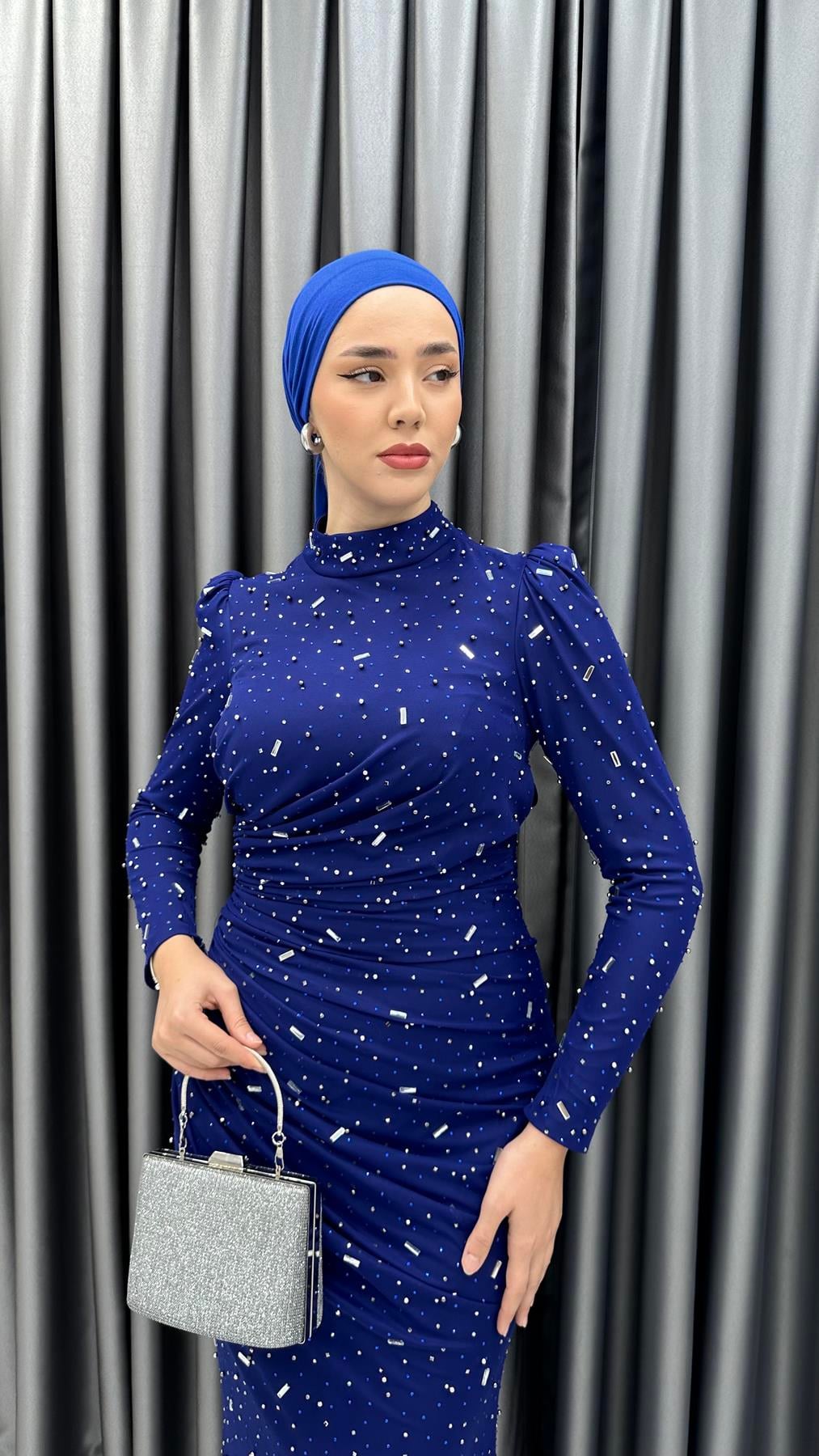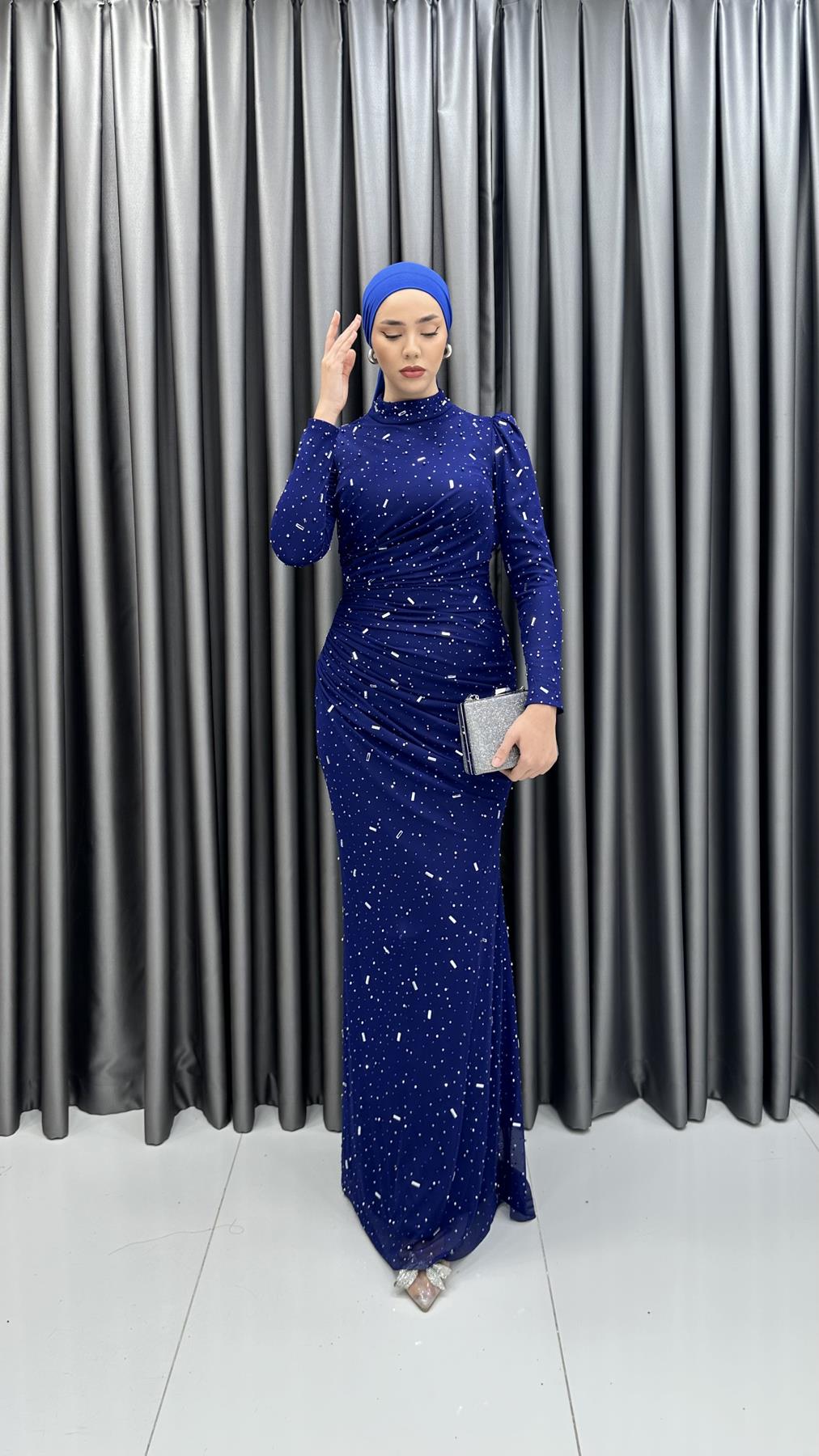 Baştan aşağı boncuk işlemeli tül kumaş ile tüm dikkatleri üzerinize çekecek abiye elbisemiz, yere kadar uzanan balık kesimli eteğe ve feminen tarzda bel drapesine sahiptir. Dik yakasıyla sağlanan zarif görüntü karpuz kol modeliyle tamamlanmıştır. Abiye elbisemizi sivri burun simli topuklu ayakkabılar ve zarf model küçük el çantaları ile kombinleyebilirsiniz. Renk seçeneği mevcuttur.
