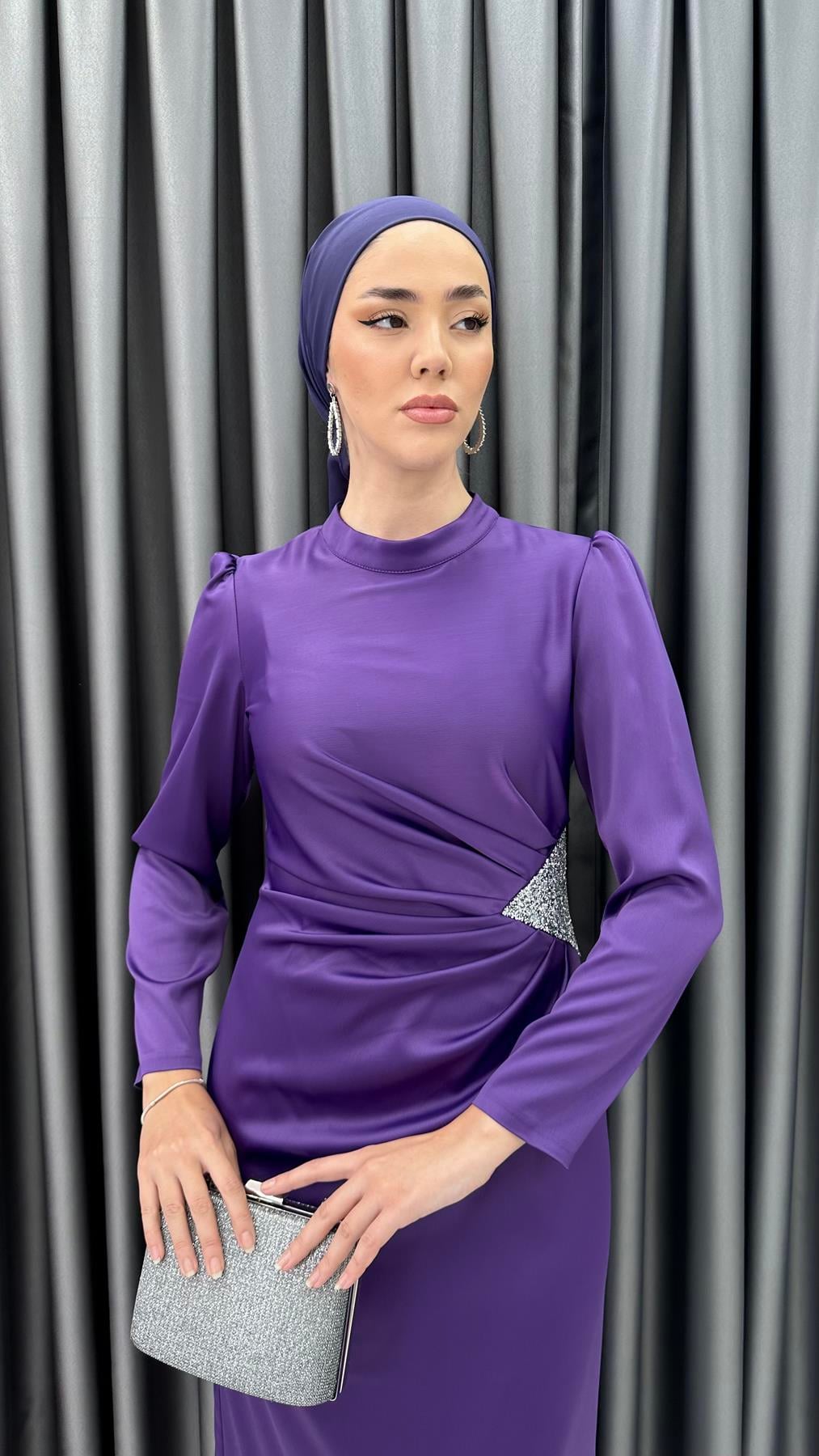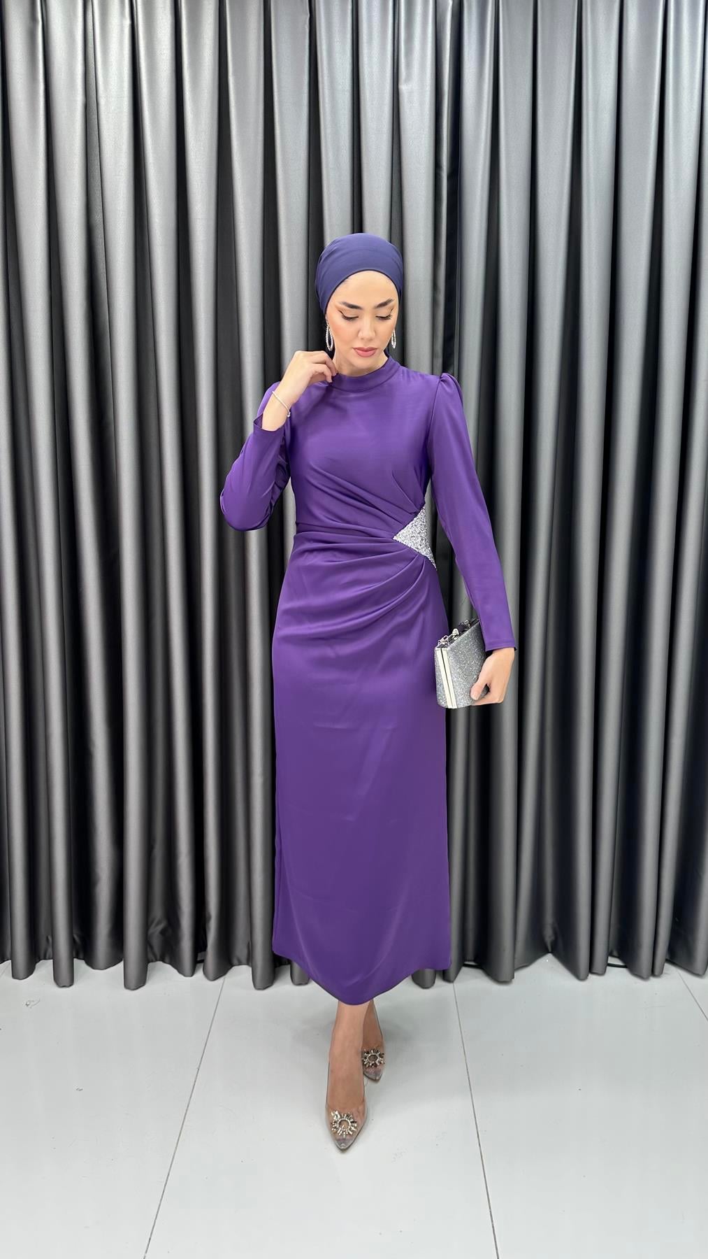 4898 S - Bel Drapeli ve Taş Detaylı Saten Abiye Elbise-Mor (1314.00555-Mor)