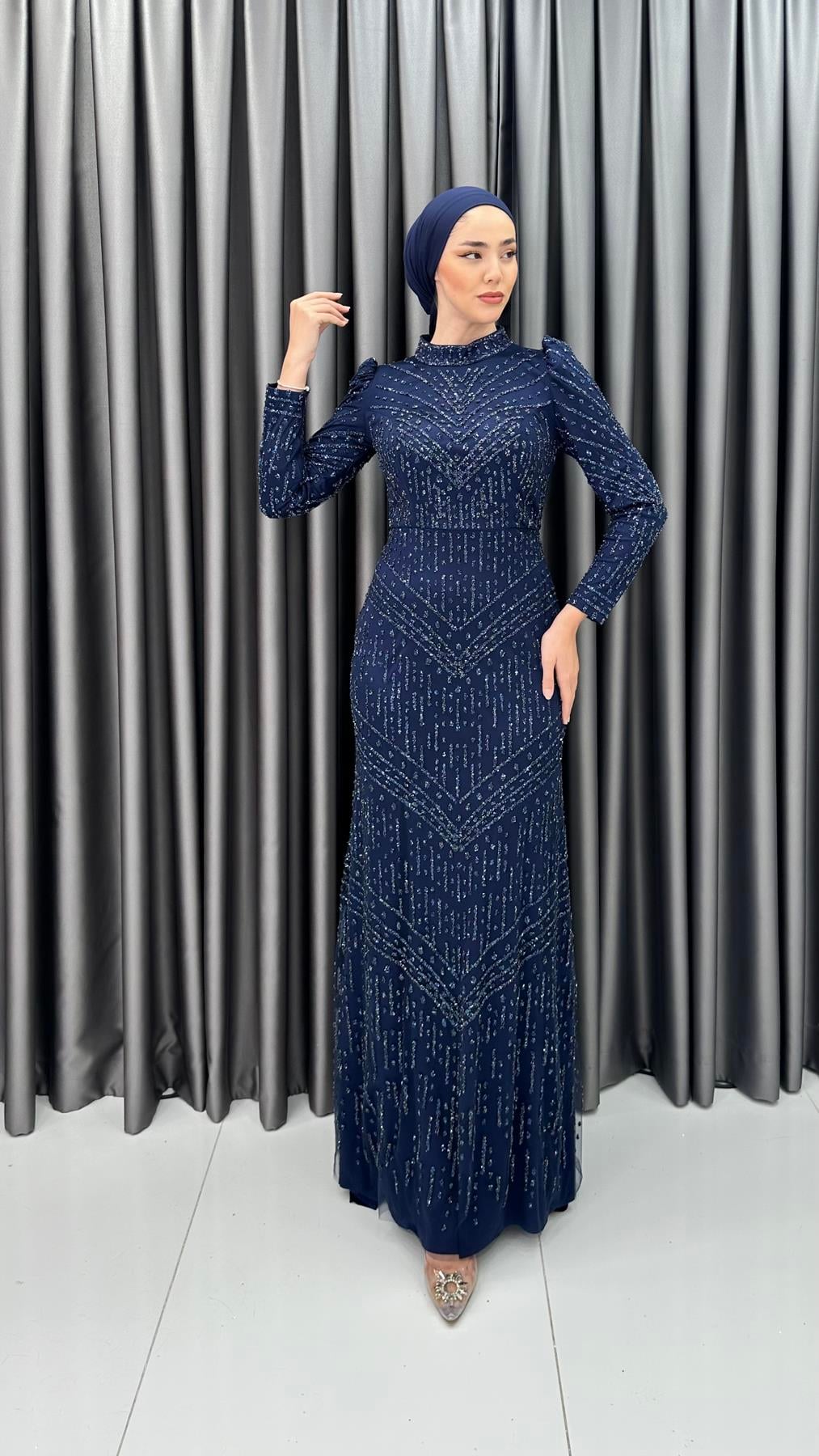 Göz kamaştıran boncuk işlemeleriyle davetlerde tüm bakışları üzerinize çekecek abiye elbisemiz, karpuz kolları ve ve hafif balık kesimiyle dikkat çekiyor. Ayrıca elbisemiz V model işlenen boncukları sayesinde vucut toparlayıcı bir göz yanılsaması sağlayarak daha zayıf ve uzun görünmenize yardımcı olacak. Abiye elbisemizi simli topuklu ayakkabılar ve zarf model el çantaları kombinleyebilirsiniz. Renk seçeneği mevcuttur.