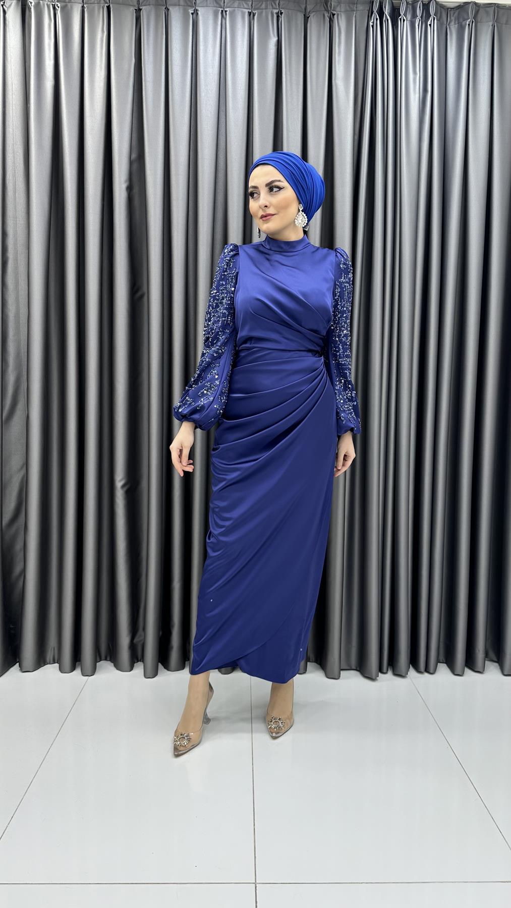 4802 H - NİLHAN Boncuk İşlemeli Balon Kol Detaylı Drapeli Saten Abiye Elbise