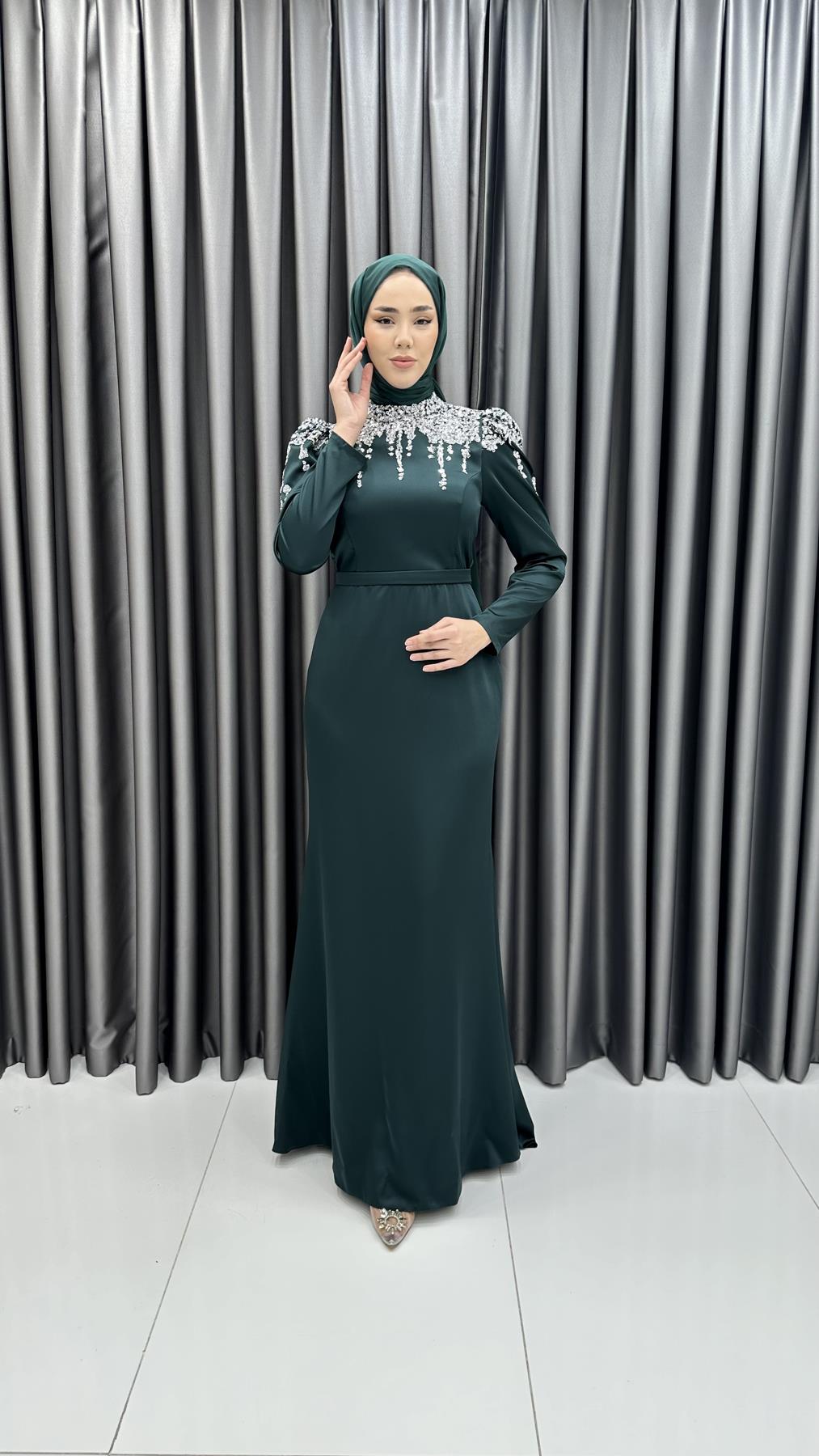 4803 H - AHUSE Taş İşlemeli ve Kemer Detaylı Hafif Balık Kesim Saten Abiye Elbise