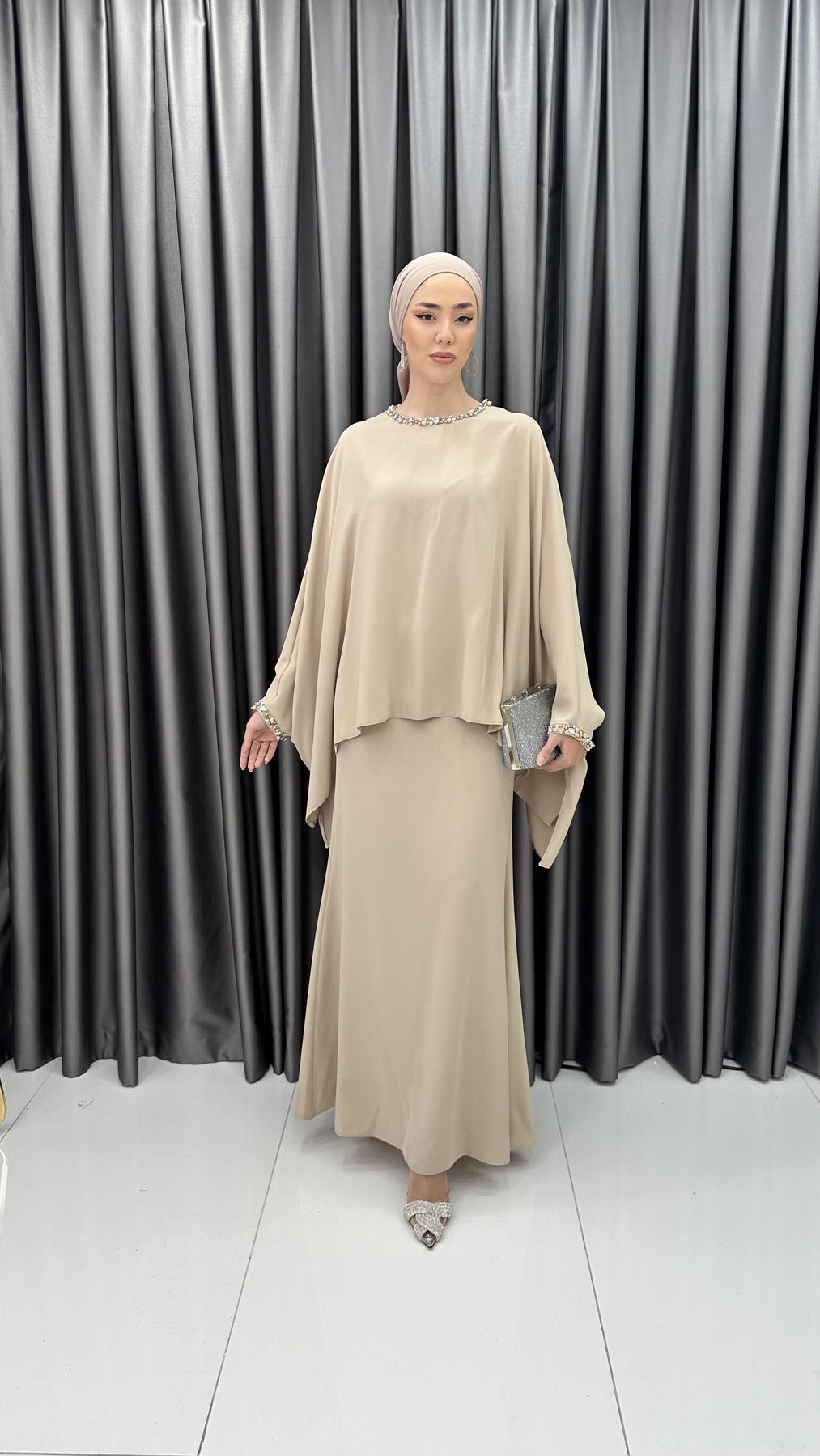 4819 H - DİLA Pelerin Üst ve Taş Detaylı Krep Abiye Elbise-Bej (1314.00676-Bej)