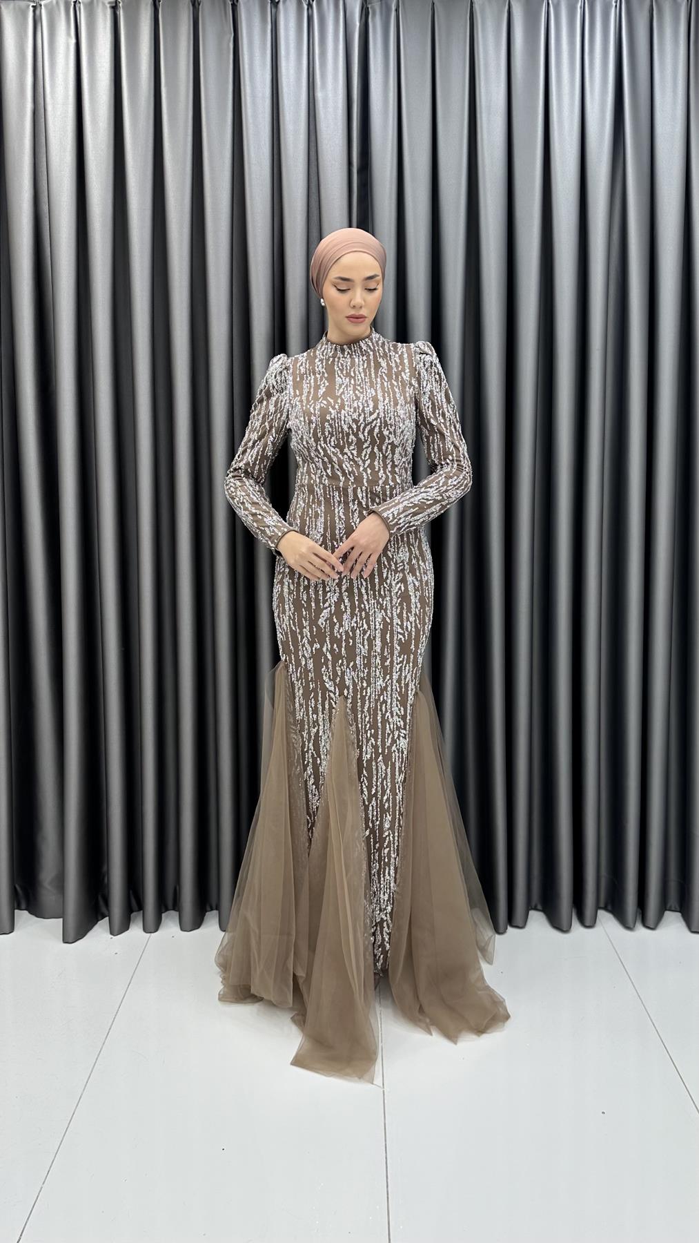 4885 H - BERFU Balık Kesim Boncuklu Tül Abiye Elbise